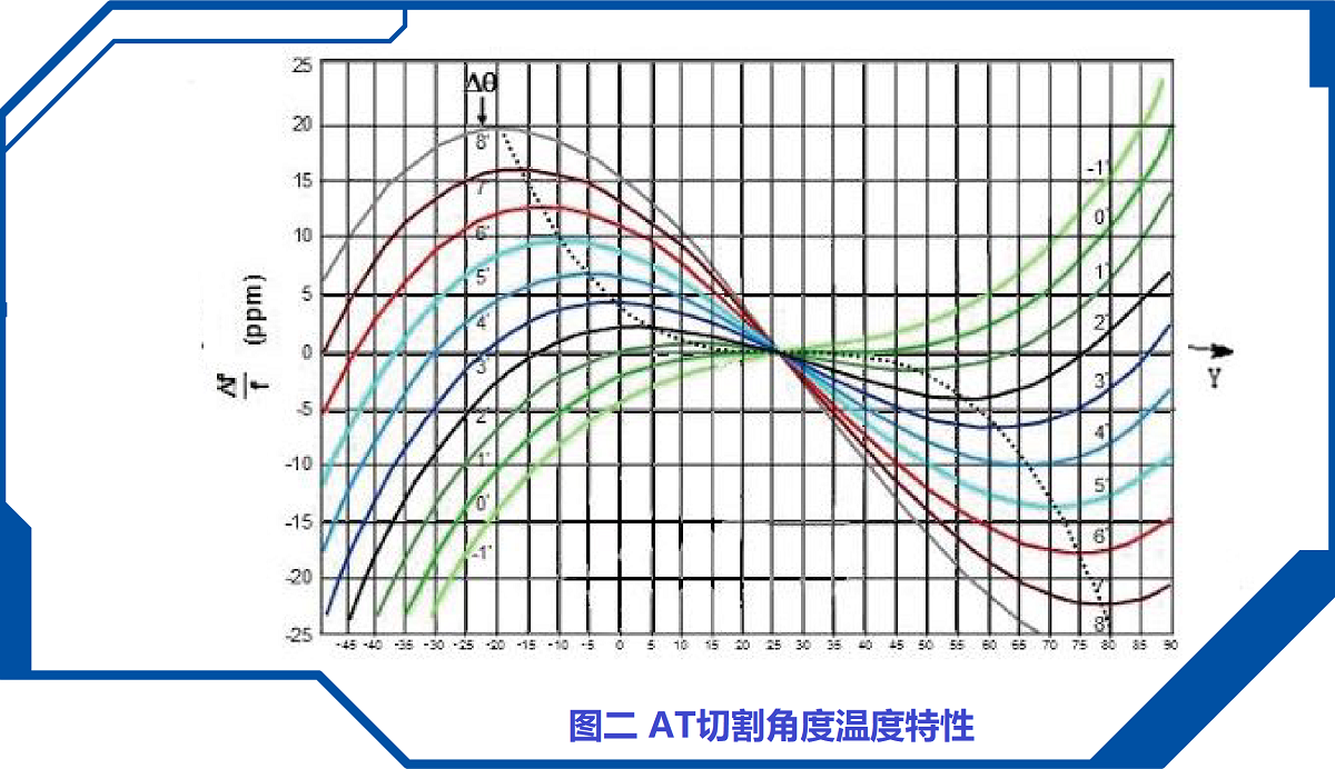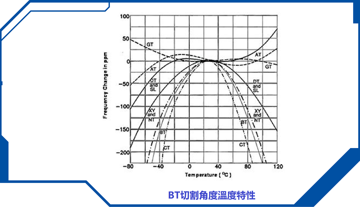 AT切割角度为35度,BT切割角度为49度,两者都适用在数MHz到数佰MHz的频率范围,且AT切割角度和BT切割角度具有不同的温度与频率曲线(见下图二三),BT切割角度温度频率误差较大,AT切割角度相对比较稳定,是石英晶片应用范围最广范及使用数量最多的一种切割应用方式。